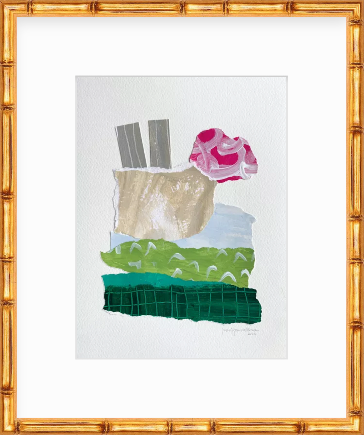 Acrylic paper collage pieces on 140 lb. cold press watercolor paper in a custom gold bamboo frame