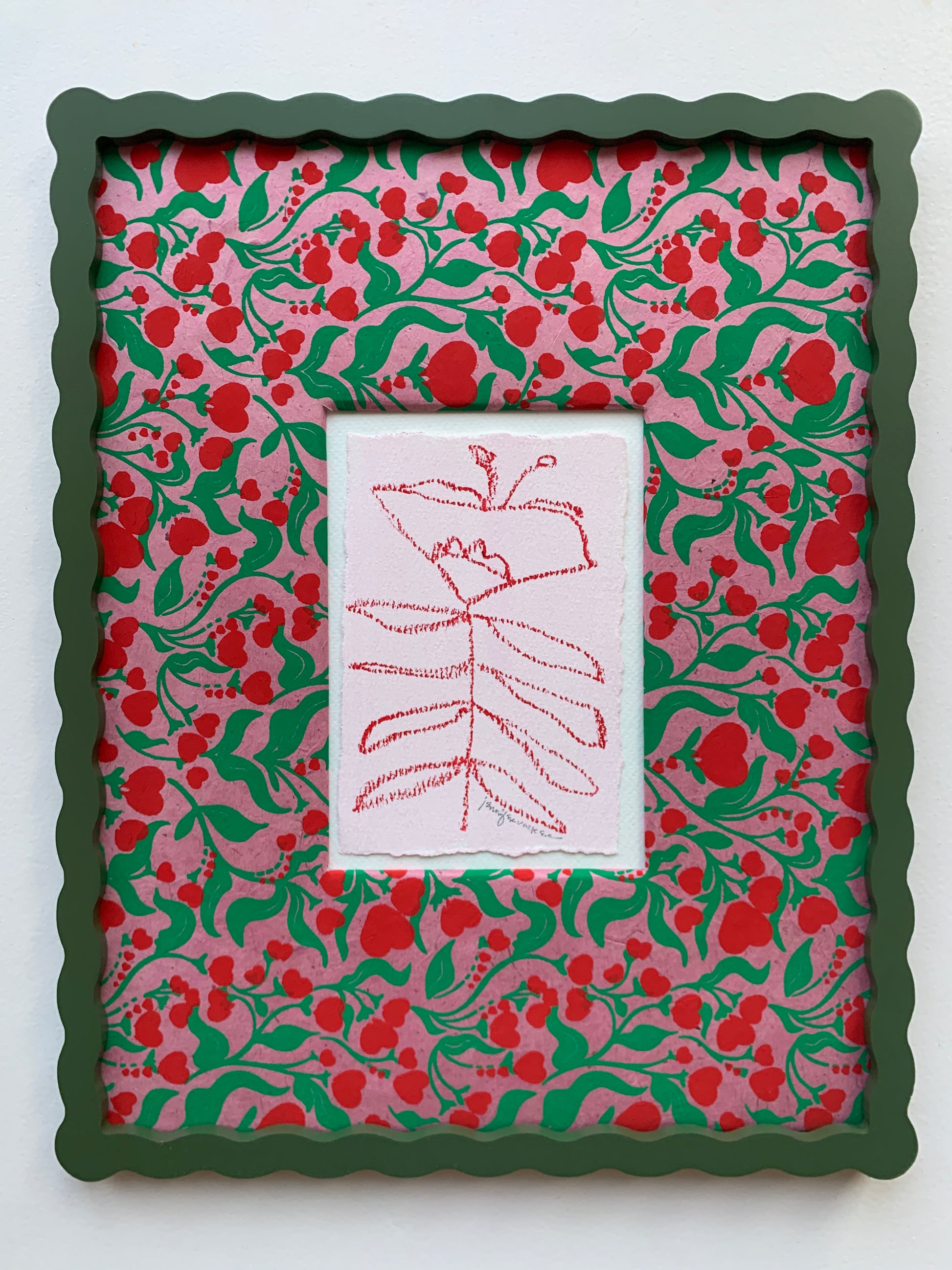 6"x8" acrylic and oil pastel flower study on 100% cotton watercolor paper, framed in an 11x14" green scalloped wood frame with handmade paper mat. Signed on front.
