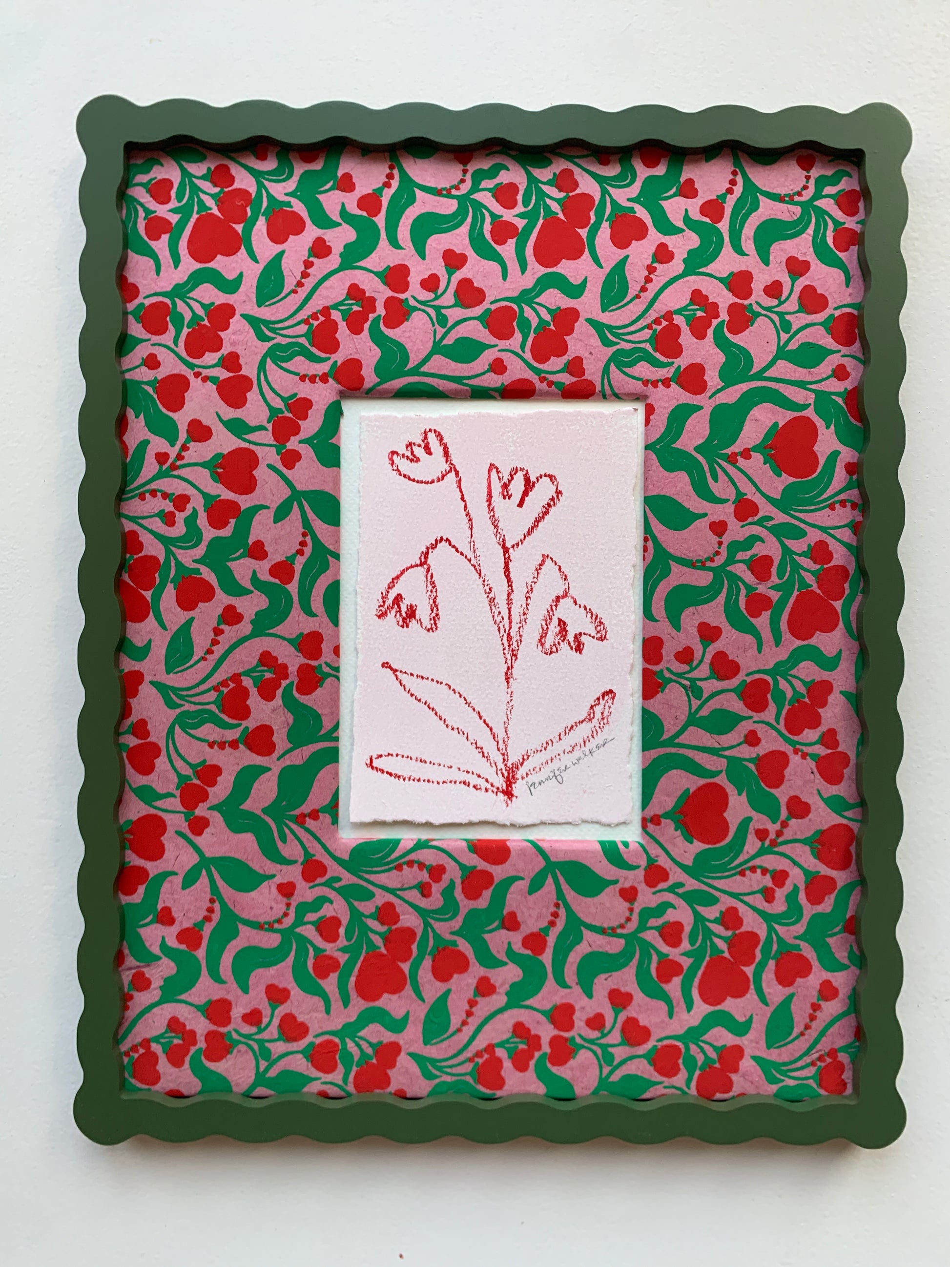 6"x8" acrylic and oil pastel flower study on 100% cotton watercolor paper, framed in an 11x14" green scalloped wood frame with handmade paper mat. Signed on front.
