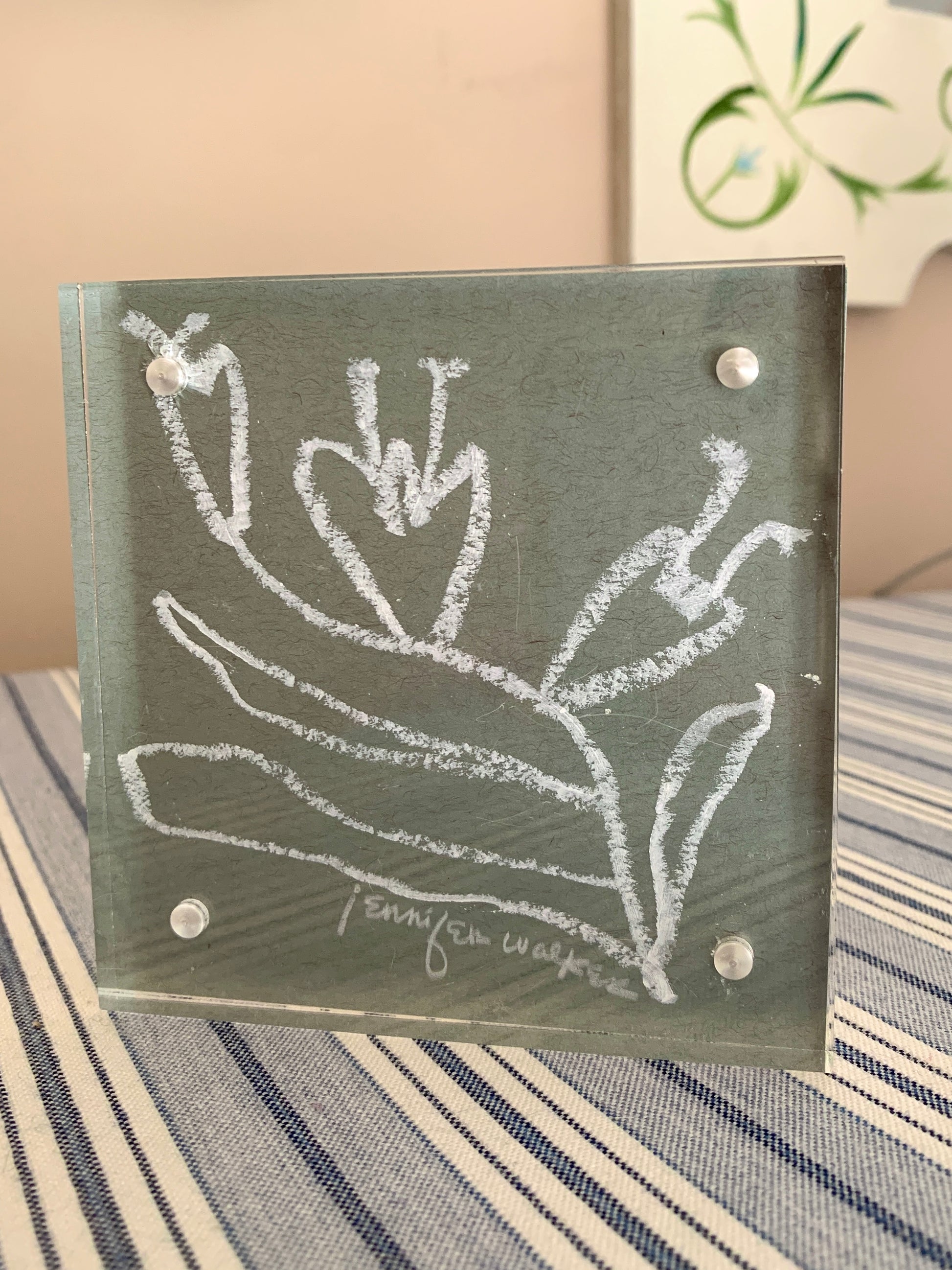 4"x4" oil pastel botanical on 184# Strathmore Toned Blue paper and framed in an acrylic block frame, signed on front