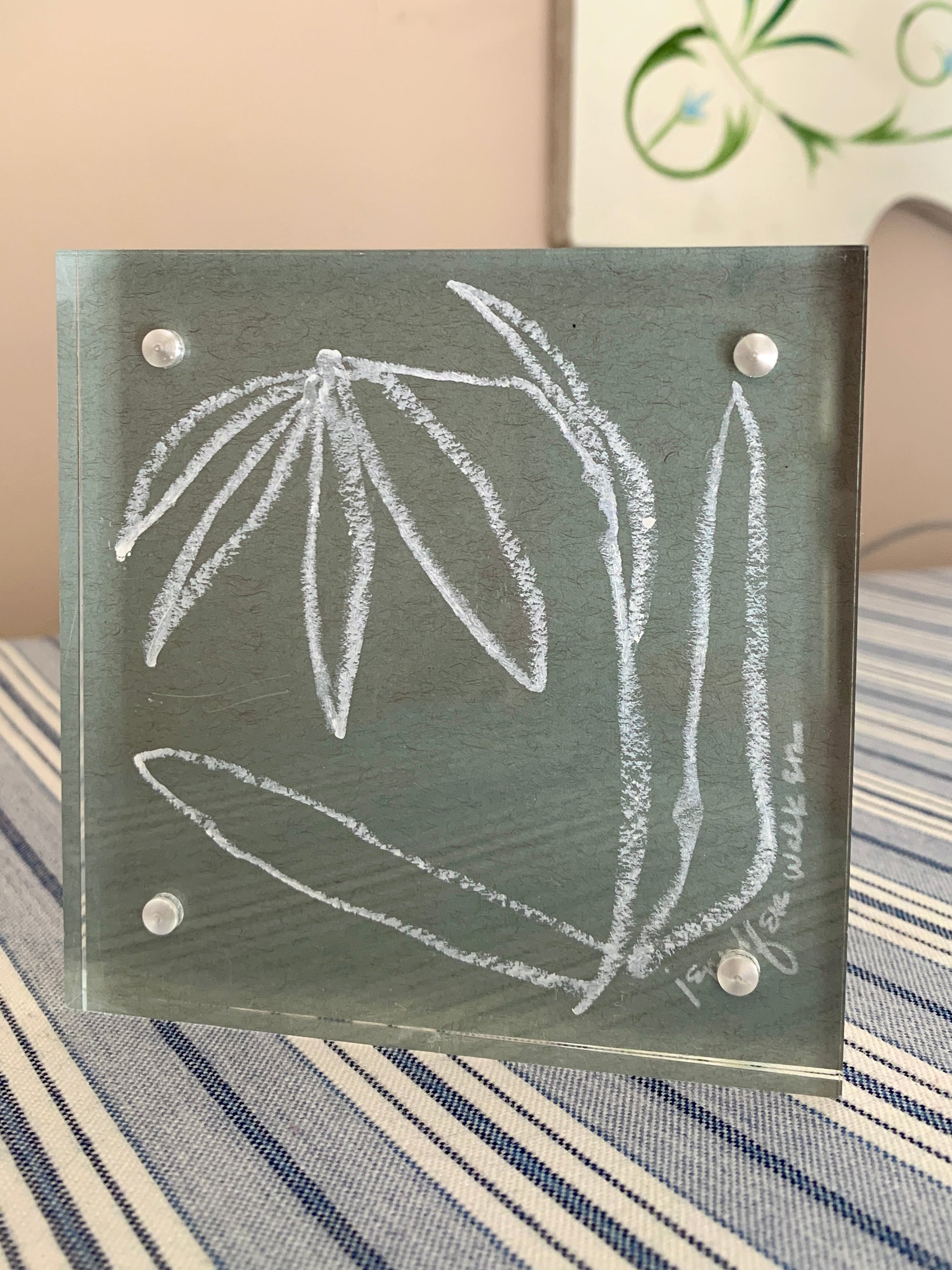 4"x4" oil pastel botanical on 184# Strathmore Toned Blue paper and framed in an acrylic block frame, signed on front