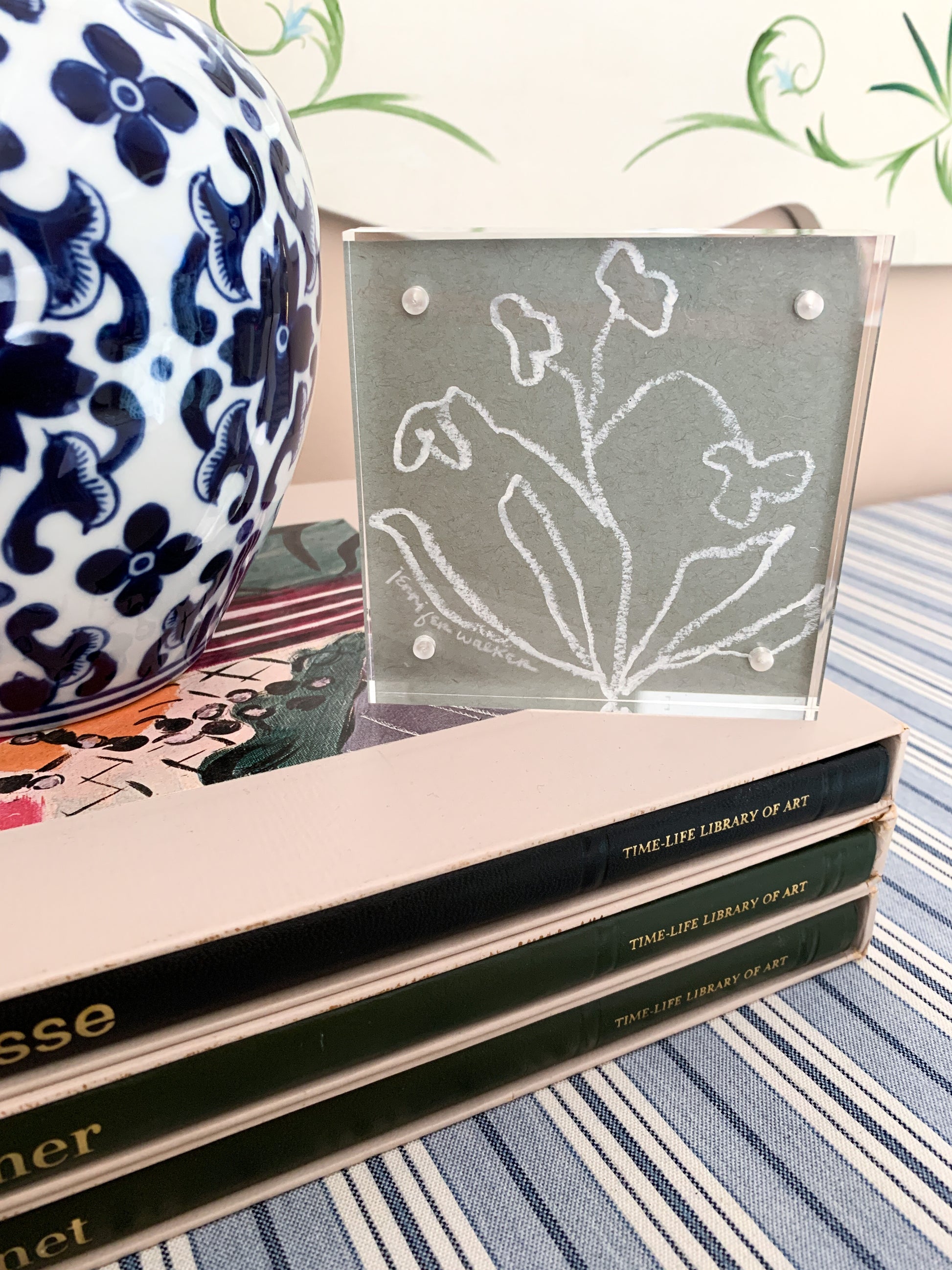 4"x4" oil pastel botanical on 184# Strathmore Toned Blue paper and framed in an acrylic block frame, signed on front